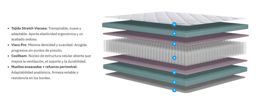 La unión de la Viscotitanium® Gel junto con nuestra carcasa SpringSac® Firm genera las condiciones perfectas para un descanso óptimo y ergonómico. El núcleo de muelles ensacados firmes proporciona independencia de lechos, evita molestias por movimientos y logra una adaptabilidad total con alta transpirabilidad.