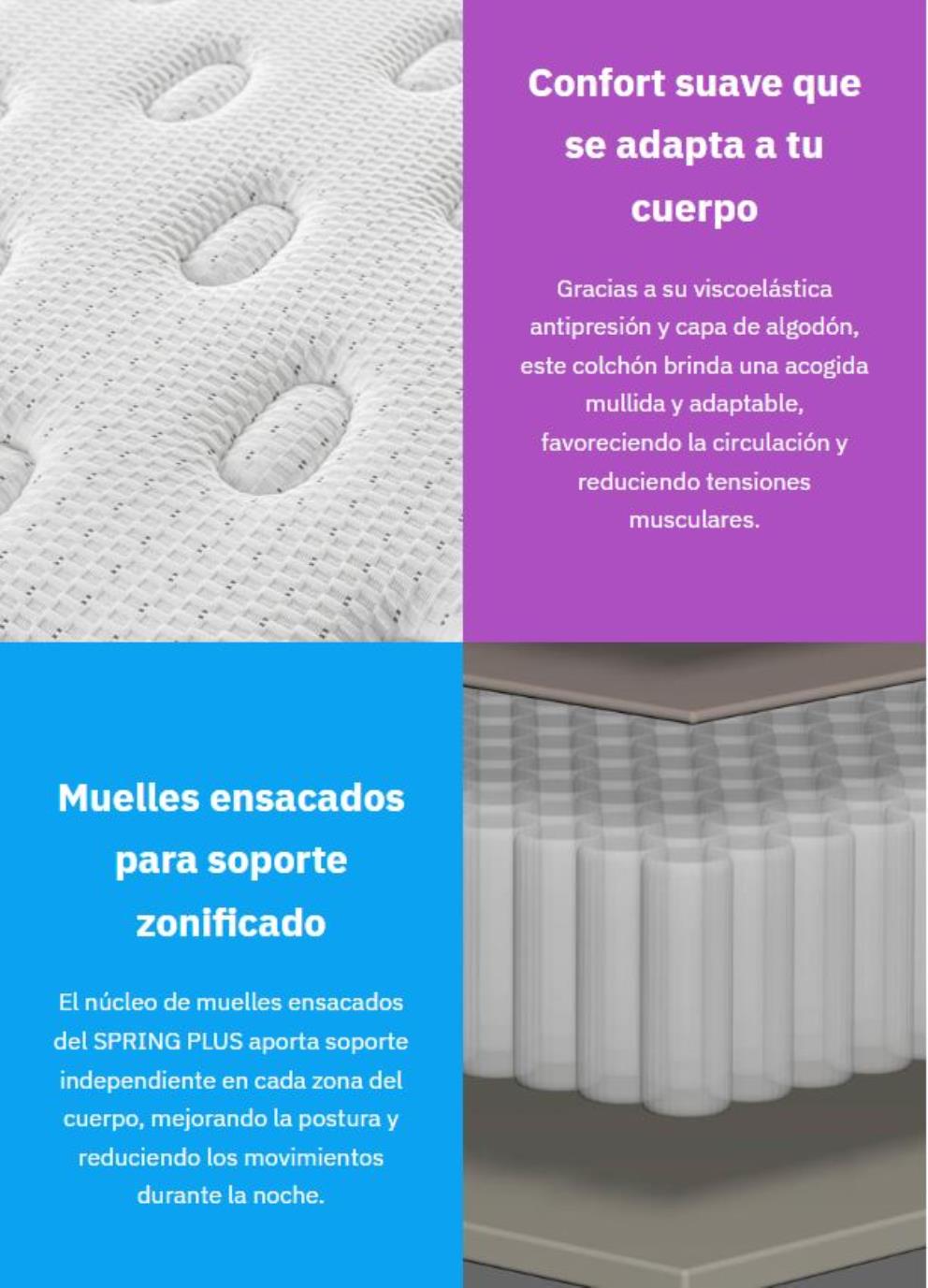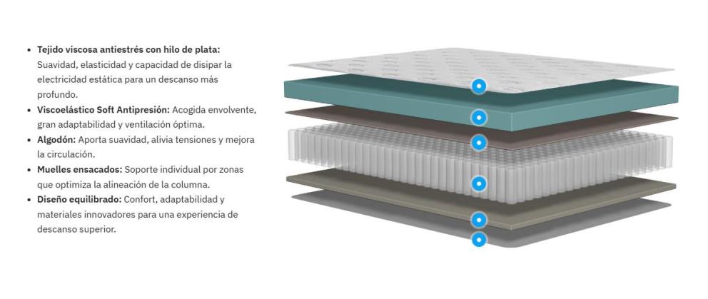 - Equilibrio postural perfecto gracias al núcleo de muelles independientes ensacados, de máxima adaptabilidad, durabilidad y resistencia.